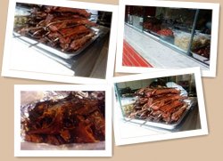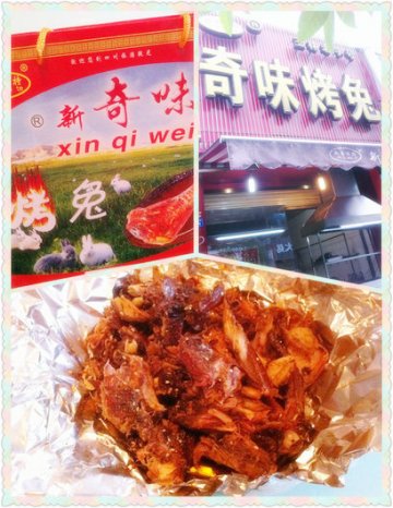 在玉林菜市场这边其实有两家的烤兔生意都还不错,一家是"王妈手撕烤兔",另一家就是这个"奇味烤兔"了,其实这家比王妈还得要早些,老早就在玉林这边扎根了.原来生意很好,王妈开了以后,生意少了一大半哈.不过个人觉得味道还是可以,兔子觉得烤得比王妈的要干香些,水份要少得多哈.#麻辣烤兔# 还是用辣椒,孜然粉,五香粉,花椒,胡椒,味精码起,好像还加了些中草药等等,兔肉是先烟熏然后再腌,还要过下卤肉,最后再用碳烤的,觉得他家的兔头和兔腿不错,干香麻辣,皮脆肉嫩的哈.