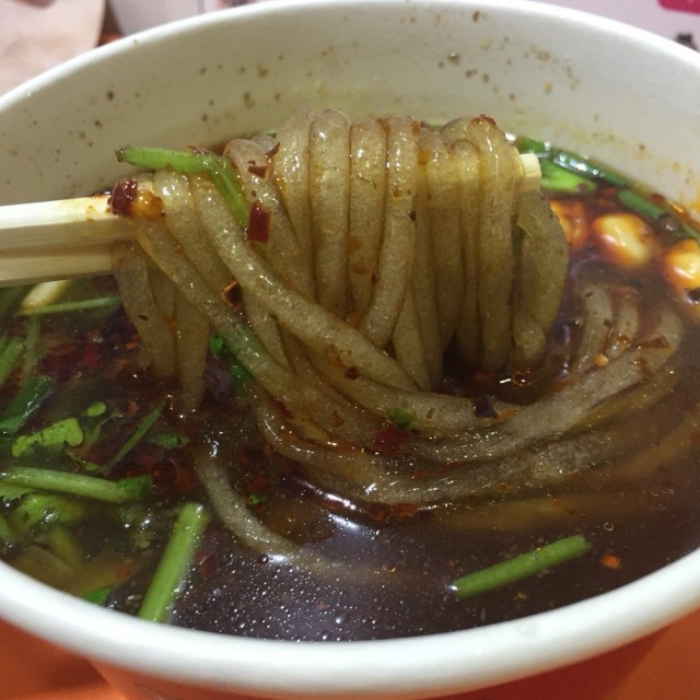 菜品:在他家买过一次酸辣粉,挺酸的也够辣,滋味很足,绝对的重口味。香菜香气很足,使整碗酸辣粉都变得很清香。花生米不太多,还挺好吃的,越嚼越香。粉儿呈透明状,很有嚼劲,只可惜量不太大,还有就是油比较大。环境:店面不大,门脸颜色很显眼,里面看着很干净。服务:服务还行。价位:有点贵。推荐:☆☆