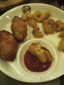 点了特价45的小吃拼盘,结果只能说是差强人意了!两只奥尔良烤鸡翅烤的有点儿老,奥尔良的口味没有能够很好的入味,看色泽就知道火候过了。其他两种小吃是薯圈和笑脸形状的薯格,笑脸的形状已经完全看不出来了,趁热的时候蘸番茄酱吃还行,冷掉之后完全没有口感了!对于这样的品质和价格,只能用呵呵来形容了!查看更多