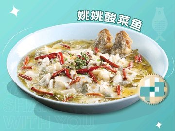 姚姚酸菜鱼中份 / 彩虹乌龙冰粉 / 金奖米饭 / 姚姚酸菜鱼拼水煮牛肉 / 姚姚脆奶 / 姚姚手撕椒麻鸡