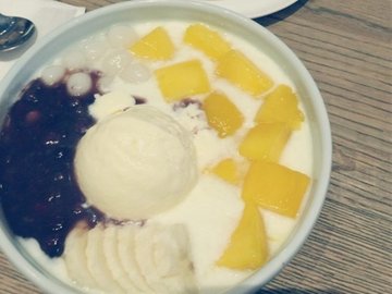 路过是一直路过看到的,不过就从没有吃过,闺蜜推荐说挺好吃的,就去吃吃看,一个人点了一份,这分量好大啊,好划算的!奶酪味道挺重的,口感很厚实哦,新鲜的芒果、香蕉、红豆、冰激凌等,自己还可以再加哦,就是位置好少啊,都坐满了