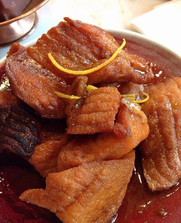 来小吊梨汤吃饭,总是觉得平淡中总能给人点小新鲜的感觉,这家店就在神路街。环境布置的古香古色,似乎他家都是这个风格的。除了每次必点的梨汤外,这道香橙烤鱼也是很爱吃的一道菜,做的有点像熏鱼,味道很好,鱼肉很紧实,甜咸口味,细细的是香橙丝,有去火的功效,而且鱼肉本身就脂肪含量低,所以适量的吃一些,也不会在身体里残留很多的脂肪。3人消费160元,经济实惠。