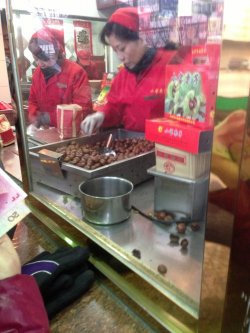 地点在金刚桥下桥的右手边,挨着金凤呈祥。附近是大的居民区,所以每次买的时候基本都得排队。栗子从13.8、14.8、15.9、16.8元的价格不等。不过13.8的价格就可以了,不太喜欢个头大的栗子。小栗子好剥皮而且很甜、很软,从中间一挤就开了。栗子皮是红亮的而且很少有坏的,所以他家也就比较出名了。