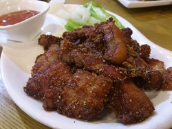 台湾菜,感觉东西好贵,买了盐酥鸡,那个就跟我们小时候放学吃的那种鸡柳差不多,不过价格贵了好多,量还很少,鸡肉炸得一点都不像,外皮很酥,里面空空的,还买了卤肉饭,这个倒很便宜,一碗,味道还不错,卤肉吃起来甜甜的,不油腻