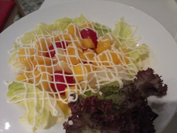 经常去的一家性价比还算不错的西餐店,比萨莉亚的菜品丰富,比必胜客的价格来的亲民。色拉是点餐中必不可少的开胃菜,要了一份水果色拉,里面有黄桃、樱桃番茄、菠萝还有少许蔬菜等等。丰富的颜色就让人看了心情愉悦,水果丁比较新鲜,酸甜可口滋味丰富,能够唤起继续下一道菜的食欲。