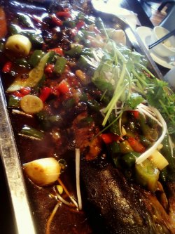 他家的名字和做的菜肴好像有点不是很搭配,走的是重庆江湖菜的风味,个人比较喜欢的是他家的烤鱼,分量很好,两个人吃确实有点困难啊,烤鱼烤的是外脆里嫩的口感,而且能吃到烤制的那种香味,豆豉的味道也很十足,辣度属于中等,配上酸梅汤正好。查看更多