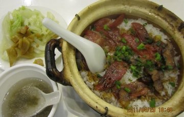 公司附近的一家港式烧味小店~腊味煲仔饭算是比较招牌的,吃过蛮多次了,性价比很高的说~双拼的,腊肉+香肠,料很足的,米饭是细长型的那种,蛮有嚼劲额~腊肉蛮肥腻的,米饭吸收了肥油,香糯可口,喜欢的,香肠是广式的,吃口甜甜的,贴边的锅巴很多很脆,喜欢的~…查看更多