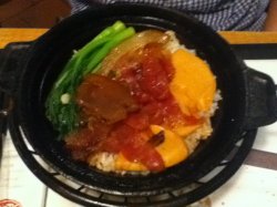 去了才知道所谓的香锅饭其实就是煲仔饭嘛,不过饭端上来的时候确实是香的让人直流口水。点的还是平常吃的比较多的腊味煲仔饭,掀开盖子,倒入酱汁,香味四溢。顶上铺着腊肉腊肠还有青菜,腊肉稍嫌肥腻了些,但是2者都非常的入味。饭在酱汁的搅拌下更为的鲜香,加上旁边嘎吱嘎吱的锅巴脆,吃的很是满足。看到旁边人点的套餐其实就多了份汤,感觉可有可无了。查看更多