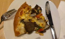 每天看电视就看到广告里面说,必胜客每天一款半价,加上诱人的图片,就好想去吃一下。今天就跟朋友出来吃了。 店子里面的环境还算不错,点了一个黑胡椒牛肉披萨跟意面,主要是只有两个人,多了也吃不完。 披萨一上来,就闻得到一阵黑胡椒的香味,西红柿、青椒配在一起,颜色也比较好看。 切成几块,拿一块放进嘴里,口感特别好,牛肉很嫩,又有一点焦焦的感觉,还有玉米粒夹在中间,加上一些沙拉酱,有点粘稠的感觉,确实味道不错。 意面分量就比较少了,只有一小盘,不过里脊肉还挺多的,配上番茄酱,味道也不错。