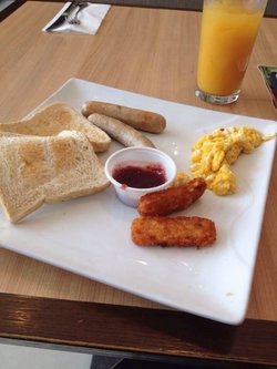 一个人 出来办事 饿了 于是跑到必胜客点了份早餐 好屌丝吧,哈哈哈很普通吧 食物分开的 鸡蛋味道清淡 薯棒炸的有点糊 面包不是松软的那种哦 有进烤箱烤一下 味道就那样只是环境会比较舒服一点 早上人也很少