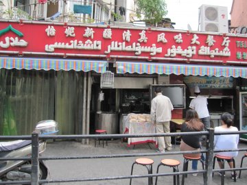 朋友推荐去吃的,说是这家的羊肉串、羊腰子、烤包子都蛮不错的~环境一般吧,就是很普通的私人小饭馆~羊肉串是3元一串,蛮便宜的,味道是蛮不错的说~撒了蛮多的孜然粉,一串有4块带肥带瘦的羊肉,很嫩~羊腰子吃不来,有股味道的~中盘鸡不错,酱汁蛮稠的,垫底的是面片,吸足了汤水,哈好味道哦~