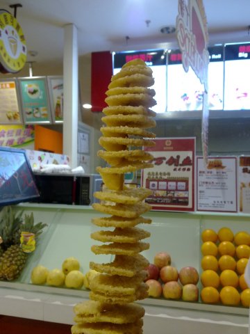 蛮特别的一家店,做的是各种小吃,披萨做的是卷起来的那种,饮料是超大杯的,土豆是串在棒子上很高一串的。点了旋风土豆和超大杯的金桔茶,旋风土豆点的是梅子味的,梅子粉撒在上面还蛮好吃的,土豆炸得软软的很厚实的一片一片的,旋风土豆很大一串真心是吃不掉。金桔茶么无功无过,很大一杯,很解渴。…查看更多
