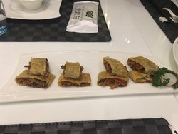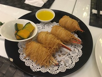 环境好,菜有意思。全程微笑服务并且说话非常轻柔,不错满载而归,蟹肉棒,哈密瓜,还有芹菜,虾仁什么,这个很鲜甜,我喜欢招牌酱烧骨赞不绝口,个人偏爱XO酱西冷芦笋,牛柳入味芦笋也鲜嫩配着酱汁吃很不错。鲜菠鬼马虾球点餐的时候服务员提醒了口感会偏酸,尝试了下和服务员提示的果然一样,给个赞!很实事求是的提示我觉得还是相当有必要的。虾球和油条菠萝的比例也很均匀。新西兰香煎羊排点了一位份的,量确实有点小,没切几刀就没了,但味道还可以,配的罗勒酱很好吃。甜品点了柠檬塔罗勒冰沙,超级迷你,美味程度倒是大大的。柠檬塔其实也就一勺子的量,上面有一层薄薄的焦糖,好吃!综合环境,服务和餐点总体很不错,价格也是不是很贵。