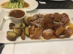 公司领导请大家吃饭,订了这里,位置有点隐蔽,在人民大舞台的上面。乘了电梯到5楼之后,再走楼梯到4楼才是我们的包房,20人一桌的,难道能订到那么大的圆台面,而且感觉和外面的大堂完全分开的,私密性很好。点了很多菜,感觉味道比较好的有蟹钳,这个吃起来比较方便,蟹钳剥好,外面炸的酥脆,蘸酱吃很不错。招牌酱烧骨,肉烧的蛮酥的,而且很入味,不愧是招牌菜。贝勒炒饭,因为人多,点了两份,没觉得有什么惊艳之处,和一般的炒饭口感差不多。有一道松鼠黄鱼造型满可爱的,弄成一只小松鼠的样子,旁边还放了点哈密瓜。外婆都要按32个赞的薯条,这个是送的,名字比较噱头,味道着实一般。还有很多菜像虾仁、疙瘩汤、牛肉什么的都还可以吧。另外,这家的甜点做的不错,吃了芝士蛋糕和马卡龙都好吃的,摆盘也比较美貌。总体还是比较满意的,除了一开始上菜比较慢,服务员态度什么还是蛮好的。