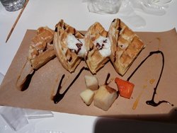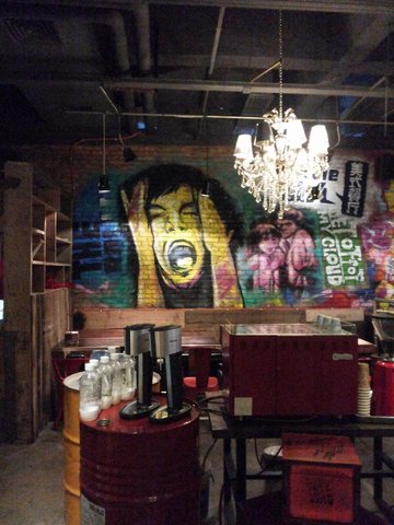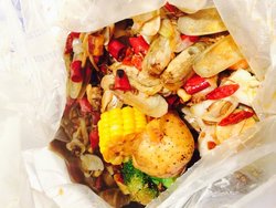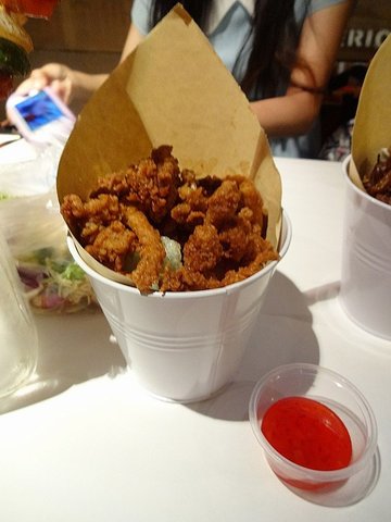 这家餐厅有个特色蛮有意思的,发现没有筷子刀叉之类的工具,所有食物都可以用手抓来吃,喝水还是用个纸袋子装,真够奇葩的~我们点的脆炸鱿鱼,串烧拼盘,吃货松饼,菜居然都是用保鲜袋装着拿过来的,而且都要带手套直接抓着吃,还真的有点烫手啊。。。我很喜欢那个鱿鱼,蘸上甜甜的酱一起吃,味道很独特,材料也还是蛮新鲜的,很喜欢这个菜,串烧就是烤肉之类的,插在透明的广口瓶子上端过来的,看是蛮好看,味道就一般般吧,松饼烤的软软的,有吃蛋糕的感觉,还不错~偶尔来吃吃,换个花样还蛮好玩的~…查看更多