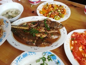 成都美食怡海花园, 看丹桥。挺干净的这家店,而且口味比较家常的感觉,炒菜方面不像以前那么多油呢。那个红烧家常鱼味道不错,颜色红润,很下饭呢,炒得其他青菜也不错,比较爽口的感觉。