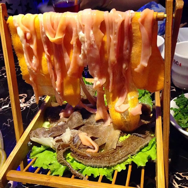 朋友特别推荐的一家店,人气特别火爆,一定要提前预定位置,最好提前一天,当天的话可能都订不到。店面的装修就是按照以前红卫兵的那种军装,杯子也是以前的搪瓷杯子,这样风格店真是越来越多了,所以也不觉得太吸引人。墨鱼汁丸非常Q,好多地方的丸子里边都是面粉,他家的感觉都是自己做的,基本上都是新鲜的肉,这点蛮难得的。鸭肠在辣锅里边涮是最棒的,很喜欢吃,要了两份。芝士丸捞出来的时候过一会再吃,免得烫到,里边的芝士很好吃。天鹅肉怎么煮都不会老,也很香,可以点一份尝尝。