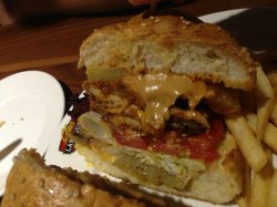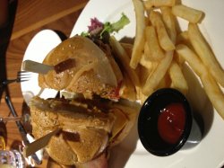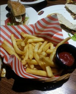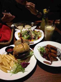 之前和姐们吃过一次~~ 觉得很不错 于是乎带男朋友来尝尝。我们俩很纠结。。。点了一个黑椒牛肉脆饼(他喜欢牛肉)点了一个带鸡肉的汉堡。我记的是夏威夷。黑椒牛肉~~ 黑椒的味道很浓郁!!!!!! 有点辣。。。 但是味道太浓了!!太香了!!!!!!! 根本不像平常吃过的黑椒牛柳!!! 味道简直是好一百倍!!! 这才叫黑椒!!! 嚼的时候都能明显的感觉到黑椒的存在。很大粒 一嚼脆脆的,还不是糊的味道 而是黑椒自身的香气 加上牛肉的肉香!!!再加上超脆的脆饼。~~~~ 一口下去 就有好满足的感觉再来就是汉堡! 每次吃都没给我插小旗子。555555555555555 我让切四半的。- - 这么一大半不得吃。先说说薯条~薯条不像是快餐里的 速冻起来然后炸的。内么细, 他家的薯条感觉是自己纯手工的。很大块!!吃起来 每一根都是又面又脆的。 而且还不会觉得油很大!!! 这样看有木有很馋~ 再说说汉堡~之前吃的是75的内个。 这个是50多的。我让多加的花生酱!我超爱吃!!! 可以看见 有鸡肉 有蔬菜~鸡肉很大!!!!!不过油也挺多的(鸡肉本身的油加上 做的时候的油) 刚吃的时候不会觉得很腻 到最后可就受不了了~!!里面的菜很新鲜~ 还是觉得花生酱好吃~哈哈。 这一顿饭 100出头把。脆饼和汉堡都是50 多。。 想要芒果条的 没有了。。推荐大家吃芒果条!!味道一级棒!查看更多