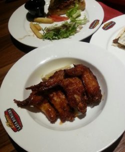 银河5楼,环境很不错,木制的桌椅和外漏的仿红砖块,浓浓的美式乡村风情。鸡翅的味道很不错,上面刷了一层秘制的酱,吃起来甜甜的,外皮很酥脆。花生酱双层很不错,花生酱味道很浓郁,牛肉饼很厚的一片,一口下去很多汁。最爱粗薯条,很香。查看更多