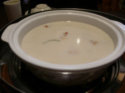 猪肚鸡 stellayxj等级42013-05-2825 浏览 关注 有专用电梯上到三楼。平时的中午客人差不多八成,不用等位。店面不大。木桌木椅木隔断,红色或黄色的吊灯。墙上有唐朝仕女图,或许是因为猪肚鸡的来历与杨贵妃有关。环境显得干净整洁带着一点古朴。靠窗的一面可以看见外面的街景。服务还不错,服务员有求必应,说话很有礼貌,较为勤快。冼手间感觉水龙头流出是热水。只是别人的椅子上大都用罩子罩着衣服,我们的却没有。类似火锅的形式,锅底的特色就是胡椒猪肚鸡,也有些别的锅底。按说明吃菜分四步走,先是猪肚鸡,再是涮菌菇、涮肉类、涮青菜。可上菜的时候却是没有顺序地乱上。调料是自助式的,有十几种料可以选择。不过算是强制性的,加上自助的水果(当天就一种橙子)5元/位。除非一桌人都不点。各种涮菜的价格有些有一点贵。蔬菜都标明是有机的,不过谁知道呢?胡椒(78元/中煲):没有小煲。鸡像是有半只,猪肚也不是很多。不是想象中的猪肚包着一整只鸡那样,已切成块和条。胡椒没有洒在汤里,另配,自已加。汤色乳白,味道很是鲜香,鸡和猪肚的味道叠加在一起,别有滋味。鸡肉较柴,猪肚也不嫩。吃到后来,虽然可以不断地加汤,可是汤的味道渐渐变浅了。涮菜选了金针菇(16元)、撒尿牛丸(22元8个)、厚百叶(8元)、西洋菜(12元)、红薯粉条(8元)和面条(6元)。撒尿牛丸肉质软,没有弹性,中间的汁水不多。面条煮久了会糊汤。不过料看上去较新鲜,涮后有浓浓的猪肚鸡的香味。一顿吃下来,胃里暖暖的,很适合数九寒天去吃。总体感觉还是不错的。…查看更多以上食记乃用户个人意见 , 并不代表OpenRice之观点。赞好分享猪肚鸡 捞王猪肚鸡 https://s.openrice.com/KtLT100fhe500检举 张贴 评分4味道4环境4服务4卫生3抵食推介美食正猪肚鸡