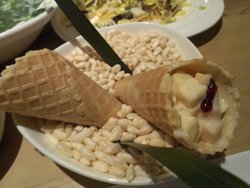 六点左右去的,居然没有等位,座位随便挑,选了沙发椅。店面的装修比较简约,暖色的灯光、装饰用的长板凳和书籍。点了推荐率挺高的醋溜木须,里面有鸡蛋、金针菇、黑木耳等等,就是看不见肉肉耶。不过味道倒是挺好的,清淡中不失营养,酸酸的开胃。还有一道“且吃且珍惜”的水果色拉,装在脆筒里面的,造型奇特,里面有苹果哈密瓜等水果小丁拌上色拉酱,6元一个。