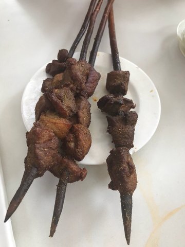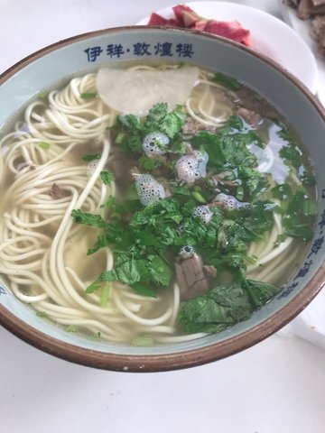 店不大,貌似楼上也有,面很好吃啊,汤头好鲜,面里面加萝卜片的 牛肉是切成丁状的面粗细适中,比较有嚼劲。面要快点吃哒 ,会糊掉。除了拉面还吃了白切牛肉和羊肉串,个人觉得白切牛肉一般,量也少,没出挑。烤羊肉串不错,粉撒的多了点,羊肉本身品质也不错,价钱也是贵的,十二个大洋一串啊!