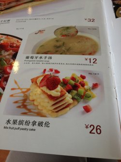 今天总算知道传说中的六合路在那里了。店面不大,人到是不少,陆陆续续到是进进出出蛮多人的,不过到是不用排队。蛮喜欢他们家的装修的,感觉很温馨很有感觉,服务员也蛮客气热情的。点了份26元的水果缤纷拿破仑,MS是他们家的招牌,菜单封面照片就是它。水果缤纷拿破仑蛮大一份的,到是跟照片相像程度蛮高的,不过就是里面的饼不太脆,有点硬,不是很对我的胃口。不过外面的水果和奶油还是不错,都吃光光了。他们家也有吃饭的,选择还是蛮多的。查看更多