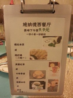 施纳德啤酒坊西餐厅这里有WIFI,有店员,觉得是休闲的好地方,店员也很热情,价格有些小贵。下午茶简简单单,一份甜品,一杯咖啡,可以很悠闲的呆一下午。提拉米苏量不大,口感细腻,可可粉放的有点多,有些微苦。咖啡味道比较淡,口感一般。查看更多