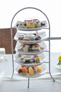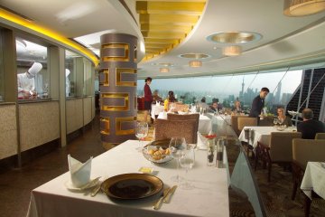 45楼,208米,旋转餐厅,观景一流。环境很好,典雅低调。厚厚的地毯,舒服的沙发椅,桌上铺着白色的桌布,精致的骨瓷餐具。窗外是一览无遗的景致,两小时一圈,360度无死角。晚上应该景致更美。去喝的双人下午茶套餐,应该是上海独一家的五层下午茶。208元加15%的服务费,含两杯饮料,是我吃过的五星级酒店里性价比最高的了。下午喝茶的客人不少。咸点、寿司、甜点、水果,色彩缤纷养眼。咸点中烟熏三文鱼明治配黄瓜和鱼籽酱很不错,面包松软,三文鱼鲜香,口感层次丰富。别家没有的水果寿司很清爽,软糯有弹性的寿司米配上酸甜的水果和蜂蜜豆酱。甜点有二层。司康搭配了奶油、草莓酱和蓝莓酱,外酥里松,香甜好吃。巧克力挞上的巧克力馥郁纯正,甜而不腻。芒果芝士、绿茶布丁、白巧克力布丁也都没有一般酒店那么吃得甜到腻,感觉较为爽口。配的是摩卡而没有喝茶,咖啡很香醉。总体感觉很好,份量很足,二个人吃不完。美景美食好基友,愉快的下午时光!…查看更多
