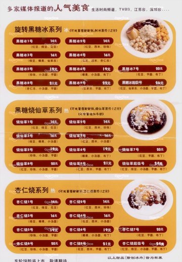 店门面可以再小一点嘛。某次去吃饭的路上经过他家门口,正好饭后大家想找个地方再坐坐的,就进来了。小道连3个人的位子也没有,到也是,人家只要做打包和外卖生意的嘛。到得有些晚,送外卖的车子也已经停进店里来了,店员到也没服务态度不好。最有印象的是他们家的黑糖奶茶。已经很久不吃台式奶茶的我居然被黑糖的甜正好到满意,说明却是不错。还叫了一份类似鲜芋仙的冷饮。记得芋圆没有鲜芋仙的好吃,有没熟的地方,芸豆到煮烂煮酥了,而且到了晚上又些配料卖完了还能让我自由搭配下,选了珍珠和西米,这家的珍珠颗粒不大,所以很Q。如果再去那个地方吃饭,还会过去买个黑糖奶茶喝喝的。