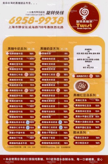 旋转黑糖冰 (上海) 网址: https://s.openrice.com/KtLS100Dkq000 地址: 上海威海路708号(近陕西北路) 电话: +86 6258 9938