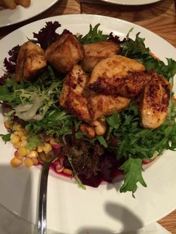 日内瓦西餐厅的环境是好到没话说,安静优雅,缓缓的轻音乐让人很舒服。菜品种类在西餐里不算少,烟熏鸡肉沙律很不错。沙律的菜很新鲜,鸡肉也入味,口感很清淡。开胃红酒也是法国味道,颜色和酒香气都很正点。