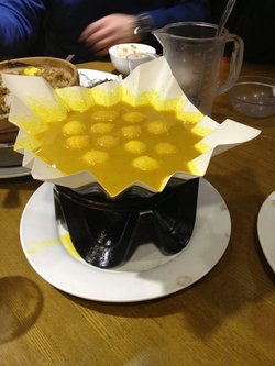 煲仔饭的话还是腊肠的最好,腊肠的油能够渗入煲仔饭中,而不是像排骨煲仔饭那种浮于表面。最喜欢挖煲仔饭壁上的锅巴,口感脆脆的~~生嗜大肠,根据铁板烧菜式演变的,原料事先不经过焯水、过油直接烹制,因为做的时候一气呵成,所以大肠又细嫩又有种焦香的味道。量大味正!咖喱鱼蛋火锅,鱼蛋里淀粉较多… 咖喱有点稀,味道比较淡了。查看更多