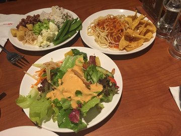 这家时时乐 sizzler的地址是复兴路51号凯德晶品购物中心3楼,汤的品种有3中,但是每种都特别好喝啊,有中式的酸辣汤也有意式的番茄汤还有奶油蘑菇浓汤,味道都特别不错,还有酸奶好粘稠的感觉啊,还有薯片脆脆的口味真不错,是烤的那种不是炸的,另外他家的意大利面真不错。