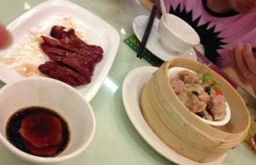 离家里附近几百米的一家茶餐厅。也是先在家里看了网上有他们家的团购才去的。团的貌似是38元的代金券。卖25的样子。点了一个他们家的蒸饺。还有一个叉烧。叉烧很好吃。烤制的火候刚刚好。不会太老。而且酱汁调配的也很均匀。蘸了他们配的蜜汁。口感就更加好了。蒸饺也蛮不错的。一笼里面有四个。不大不小。包的也很紧实。里面馅也很足。好吃的呢。