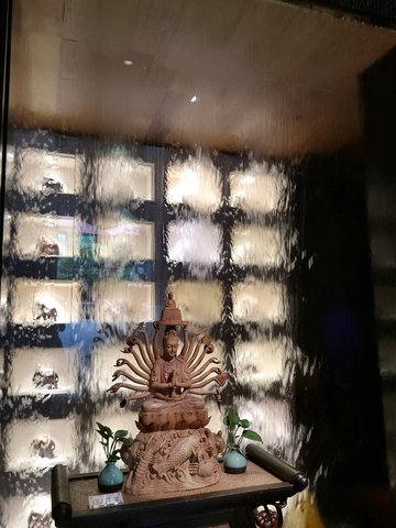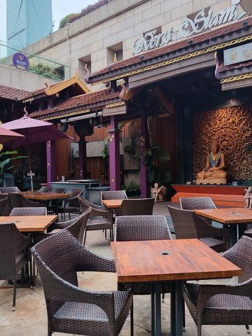 废话不多说直接进入正题,七点半到店,我提前一点就到了,在会展中心D出口,出口走出来有一个玻璃门,从玻璃门纸通往广场,直接走到底就是。店外面还有花园,还有露天的座位,走进店里,店里装修很泰国风,比如佛像什么的,走到我们那桌,看见圆桌子上摆着三个大西瓜雕花,人齐了之后经理开始介绍,说这是为了接待尊贵客人的礼仪,这个西瓜只能看(心里在想好浪费啊= =给我吃嘛)是大厨今天花了三个钟雕出来的。介绍完拍照之后就把西瓜撤了开始上饮料,有芒果汁、榴莲牛奶、水果茶、泰式奶茶,没人都不一样,= =没喝到想喝的。然后经理开始介绍香料,有青芒果,香茅(长的那个细细的)还有泰国香菜之类的,他那个姜我闻了一下很香,而不是刺鼻,有一种甜甜的味道。【金钱虾饼 118】用一个船一样的器皿装着萝卜雕的可爱的小象端上来的,虾饼只有四块,等我们拍照完之后就段回去切了,然后再端上来,虾饼是酥软的,不像一般的虾饼是实实的,虾饼蘸着甜甜的酱,让我越吃越饿= =(不过回来看到虾饼118的价格我也是吓到了)【酸辣生虾 198】端上来的时候有几个虾头还在动,这道菜是生吃虾身,虾头是要拿回厨房炸一下再端上来的。平常都不怎么吃生的我,拿着生的虾身,倒吸一口冷气,还是吃下去了,没有想象中可怕,脆脆的,酸辣酸辣的,口感很滑,还不错。虾头炸了端上来,主要是吃虾膏。【香叶西米糕 29】【芒果糯米 29】【南瓜糕 29】【椰子糕】觉得都很好吃哈哈哈,【炭烤猪颈肉 88】分量比较少,不过很香,猪颈肉一直都是我的最爱,微甜,又有点韧性,烤的很到位。【菠萝炒饭 116】一份饭可以分成五碗,炒饭里面有腰果,肉松,菠萝,服务员可以帮你拌匀然后分,想想自己还是第一次吃用菠萝装的炒饭呢哈哈哈。自己本来是讨厌吃肉松的人,不过拌匀之后和菠萝什么的一起吃,反而很香,没有很奇怪的感觉,虽然吃完很想再吃一碗可惜分量不够。谢谢暹罗泰食馆的招待,还有经理的热情,经理是泰国人,在北京学习了商务中文什么的,中文讲的挺溜的。觉得这家店还不错,可以请客户吃饭什么的。…查看更多