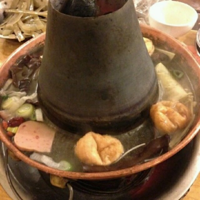 热气羊肉是我一直很喜欢的,他们家也很出名,在一条宁海东路上就开了两家,看哪家人少就进来咯,味道应该都是一样的。锅底就是普通的白水,然后会给你一份调料自己倒进去,上边撒的都是味精orz··,蘸料就是麻酱,还赔了点葱花,锅是传统的木炭火锅,我比较喜欢这种,感觉比电磁炉吃起来更有味道。热气羊肉,就冲着这个来的,很大的一份,就是没有热气啊,口感还不错, 很嫩,片切的也不是很薄的那样的,吃起来蛮过瘾的,两个人吃那么多明显的有些太多了,嘿嘿,最后点的蔬菜什么的都没怎么吃。百叶包也是招牌,很好吃,百叶很薄,里边有新鲜的蔬菜,应该是荠菜吧,很清新。