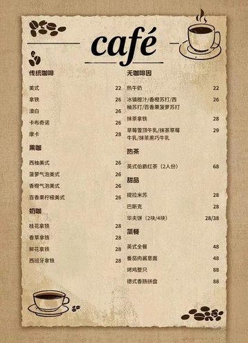 鲜花拿铁 / 华夫饼 / 全日制早餐 / 草莓雪顶牛奶 / 摇摇西柚夜 / 菠萝美式