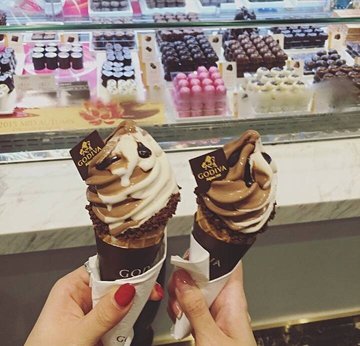 休息天就应该出来吃点美食呀,godiva的巧克力冰激凌也是想吃很久了,双拼软巧克力冰激凌很好吃哦,半边黑巧克力味道还是很好吃的,味道是尤其明显的巧克力香甜味道,边上一圈是纯黑巧克力,味道更加是浓上加浓,白巧克力的味道和牛奶味差不多呢。