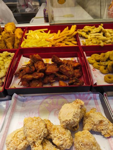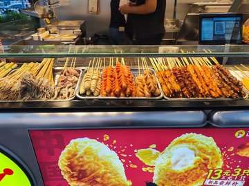 香辣鸡排 / 小鸭胗串 / 秘制鱿鱼须 / 单签中翅 / 香辣鸡排烤肠乳茶 / 羊肉串