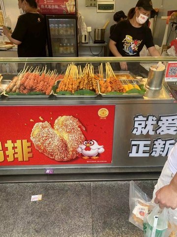 香辣鸡排 / 小鸭胗串 / 秘制鱿鱼须 / 单签中翅 / 香辣鸡排烤肠乳茶 / 羊肉串
