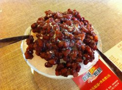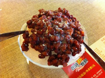 红豆冰山,感觉味道很一般啊~红豆倒是很甜,但是甜的有点腻口,刨冰的冰渣不是很碎,颗粒好大~完全不能和红豆相融,吃起来感觉界限分明,要是能融合在一起,味道就更好了。奶油培根意面,一点咸味都没有,从服务员那儿要了点盐,撒了一点,感觉味道才好些~里面的培根很少,奶油味道很浓,总体来说还不错。