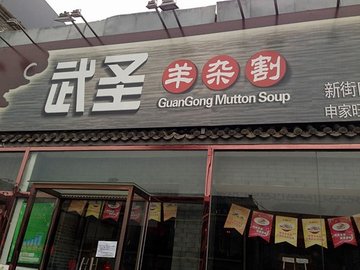 武圣羊杂割新街口东路(积水潭医院 后海), 新街口。地方很好找的一家店,连锁的店面,招牌很明显的呢,冬天来碗羊汤很不错,来了一个小碗的羊杂汤,14块钱,等了三五分钟就好了,就是感觉里面的那个粉条很多,里面的羊杂之类的虽然也有一些,但是感觉性价比不高,味道一般,我吃过比这里更好吃的味道的。