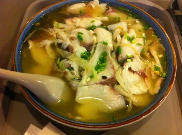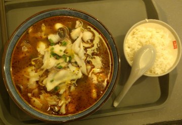 来福士广场,顶楼美食城,水煮鱼。朋友闹着要去吃吃,我就从了。哈哈~~主要是她请客。到了地方,搞得像日餐馆似的。不过也没什么不好,干净又简洁。点了个酸菜鱼,不一会儿就上桌了。上面漂漂亮亮铺着大大的青鱼片,要小心翼翼才能夹起。好不容易送进嘴里真是入口即化。汤头,鲜美带点酸味。要了碗白饭,汤绝对拌饭佳品。本来还要点些其他的,实在是吃不下了。下次再来吧。