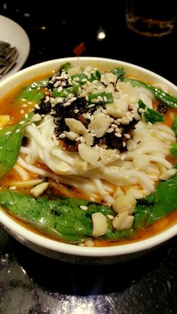 人满满的嘛,生意不错哦。吃过怪味的,服务员mm说比较辣,不能吃辣的不要尝试,然后就点了鱼香的,一开始还迟疑来着,本来就是鱼么怎么还鱼香哈哈。专门提一下,有个mm服务态度超级好的,不过到最后我也没问人家的名字,瞄了一眼好像叫什么欣,三个字,实习的,服务态度真的很好,店长一定要雇她啊哈哈哈。鱼香味的清江鱼,味道酸甜辣,真心不错吃,不过配菜就差一些了,可能这种口味的汤不太适合菜类,土豆豆皮都挺好吃的,莴笋的味道就差些了。麻将凤尾,就是麻酱油麦菜,麻酱肯定是里面放了东西的,不过很好吃。川味凉面,挺好吃的。果仁菠菜,花生和杏仁,杏仁不甜不过和菠菜是绝配哦。还点了个甜的蓝莓豌豆泥吧应该是,甜的配辣的很好吃。川北凉粉有点硬,不造为啥,还是因为在家都自己煮凉粉吃,所以觉得硬捏= =环境不错,桌子挨的近但也不会挤,来吃饭的人不少,一直保持这样生意应该很不错的说。添水很及时,茶味道不浓不过挺解腻的,还会再来吃的哦。…查看更多