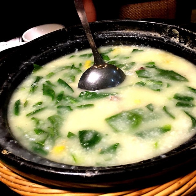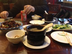 这家店的特色就是,汤的食材都是你自己选择的,然后放进锅里拿到后厨房去煲,里面不放任何调料,煲好之后拿上来的汤是淡的,盐都要让你自己加。我爸爸妈妈3个人选了一只一斤三两的乌骨鸡,配料选了冬瓜、腐竹红枣枸杞还有一些菌菇,一共78元。汤色面看上去油光蹭亮,把鸡油都熬出来了,味道很鲜美,冬瓜吸走了些许鸡油,菌菇吃上去也吃得出记得鲜味。妈妈说以后自己家里煲汤也不放任何调料,还是吃原味的鸡汤最好吃。黑胡椒牛柳粒,胡椒味道太重啦,有点咸,要过饭吃,不过还是很嫩的。玉米烙么,十分普通的点心,味道么也大同小异,还是可以吃吃,就是没什么特色哦。…查看更多