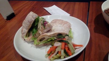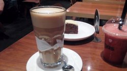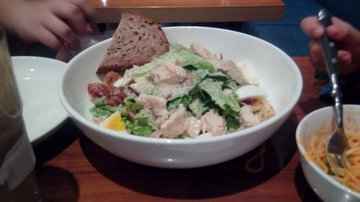 那家店人很少的,点了胡萝卜蛋糕不错啊,厚厚的,里面内容也多,凯撒色拉很大一盆,里面有鸡肉有面包,一盆一个人吃就饱了,点了杯榛果拿铁,比星巴克的杯子要大了,味道也很正,三明治好大2个,很健康的看起来,三明治里有蔬菜有肉,吃一个就饱饱了