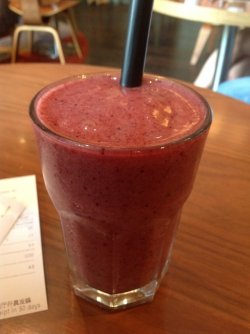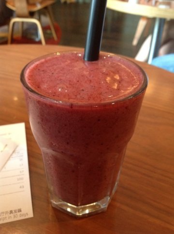 走累了,想喝一杯饮料,星爸爸里都是人,对面的沃歌斯却还有空位,正好!看看四处环境,还蛮幽静的,窗外还有小树遮挡,我特别喜欢他家的大黑板,每天都可以把菜单清楚的写在上面供客人选择,很棒的设计。我点了莓莓奶昔,眼神不好,看成了草莓,结果店员可爱的告诉我,这是莓莓哦,不是草莓哦,把尴尬的气氛转化了,饮料除了能喝出草莓的味道之外,我是猜不出还放了点什么,味道么稍微甜腻了一些,如果不是冰块冲淡了点,估计还要浓郁吧,那我想我可能就不会爱了,这样的才刚刚及格呢,偶尔实打实的果肉经过吸管跑到嘴巴里来,这可比冲出来的健康得多,朋友养身得点了一杯茶,坐在旁边都能闻到茶叶的香味呢,看起来应该也不错喝,她后来告诉我,其实有点淡啦,但她本身就喜欢清淡的,正正好。两个人在店里聊了好久才走的,看着旁边一家子分着吃色拉,想以后有机会也来尝试一下他们的套餐。