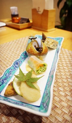这家的位置不错,很方便。占据一幢小洋房,三层的店面,很有日式风情,门外有小小花园。浅木的装修和色调,简洁中带着淡雅。墙上的格栅、装饰画、角落的花卉、木质的吊灯、架子上的特色器皿。。一楼有吧台,楼梯墙面上的玻璃柜里也有不少酒。整个环境感觉很不错。服务很赞,端茶倒水收拾都很及时,态度温和有礼,遇到了都会打招呼。点餐用的是IPAD MINI。怀石料理套餐有几种价位可以选,也可以单点,还有实惠的午市套餐。吃的是11道式的套餐,足足吃了两个多小时。餐具真是很漂亮,美丽的颜色和形状,据店员说是来自日本,一个就要上千。好想偷一个走,哈。。餐前酒后是精致的三样前菜:火腿、三文鱼和鹅肝,咸、鲜、香。冷菜是明虾和飞鱼籽沙拉,虾肉一丝丝的,很爽口。刺身拼盘摆得很有意境,鳌虾、金枪鱼、平贝和海胆。鳌虾很鲜很滑很嫩,酱油碟美得。。主菜是煎雪花和牛牛排,虽然是七分熟,可肉质仍然嫩滑多汁,稍油了点。西洋盘是烤龙虾和煎鲍鱼,龙虾肉质洁白弹滑。鲍鱼很鲜。还有炸鱿鱼、寿司、土瓶蒸、甜品和餐后鸡尾酒。。。饮料是果汁和啤酒畅饮。看似每道菜不多,到最后竟吃撑了。总休感觉很好,体验了一回怀石料理。查看更多