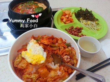 从高中时期就一直深爱的一家不起眼的小店,10多年来一直没有店名的一家韩式小馆,真心佩服老板对于店名的执着,和对食物品质的坚持。物价飞涨的今天,从菜单和菜量就不难看出这里是真心的实惠。这边最特别的就是超大碗拌饭,各种口味都很出色,尤其是辣拌饭系列:辣牛肉饭,辣鸡肉饭,辣五花肉拌饭,辣鱿鱼拌饭。。。总有一款和你口味!球球最喜欢的是辣鸡肉拌饭,扎实大片的鸡肉在辣酱的激发下显得格外的顺口,别看这一大碗红彤彤好像全是辣椒,其实这边的辣拌饭用的都是韩国本土的拌饭辣椒酱,有微微的酱辣口感,能吃小辣的妹妹就完全可以驾驭!而且配菜里的青椒和卷心菜提供了充分的甜度,加上嫩嫩的煎蛋真的让人停不了口!另外球球还要特别推荐一道汤品,就是这里的辣牛肉汤!刚刚上桌滚烫的热气里就散发着浓浓的牛肉香气,不同于其他大的韩料店里的牛肉汤这边没有加粉丝,而是用牛肉丝和菌菇代替了!重辣的汤头里充满了浓郁的牛肉香气,汤内的菌菇蛋花青菜都可以拌白饭来吃,这样说起来更像是一道汤菜呢!辣辣的超过瘾!这里真心的推荐给大家,因为实在是太实惠了,4种免费小菜吃完还能再续,一份拌饭一个女生吃不了,一般说来一饭一汤2个女生吃都刚好!这里的炸蔬菜也很棒,馋猫们可以点来试试,重点是真心很便宜!